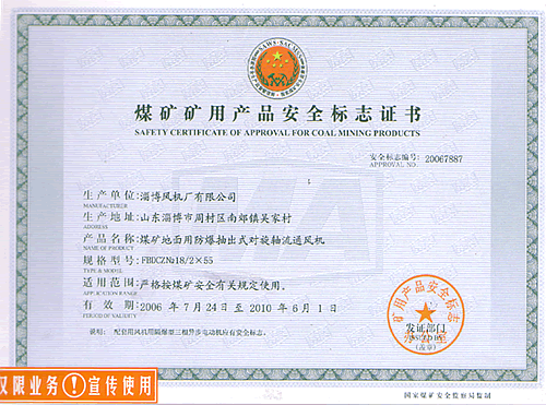 產品均獲機械部、煤炭部和煤科總院頒發的生產許可證、鑒定證書和MA安全標志。K系列礦用節能風機獲國家星火項目銀獎和冶金工業部科技進步二等獎、省科技成果一等獎等榮譽稱號。